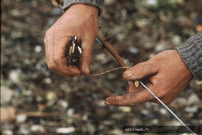 Une fois le cep de vigne taillé, le bois qui constitue la charpente doit être attaché au fil de support pour que la plante se développe horizontalement afin de bénéficier d'un meilleur ensoleillement.